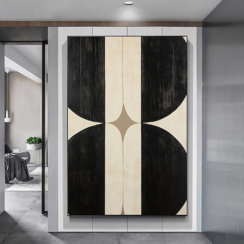 dipinto a olio astratto geometrico fatto a mano, semicerchi neri simmetrici, sfondo beige crema, pennellate di impasto strutturato, diamante centrale in bronzo, vernice a strati, arte minimalista,