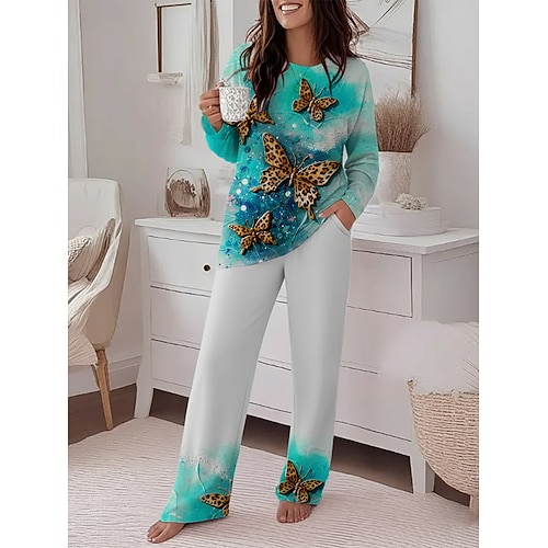 Per donna Quotidiano Elegante Set da due pezzi Tuta Set di Pantaloni Manica Lunga Girocollo Grafico Farfalla Stampato Casuale Quotidiano Verde Primavera Autunno Vestibilità regolare