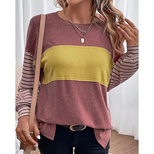 Per donna Maglietta Blusa Blocco di colori A righe Elegante Moda Manica Lunga Girocollo Top Regolari Quotidiano Uscire Weekend Patchwork Rosa Vino Verde Cachi Grigio Estate Primavera Autunno