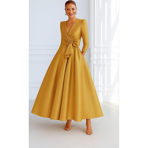 Abito da Sera A-Line Elegante Ospite di Nozze Formale Lunghezza Piena Manica 3/4 Collo a V Con Tasche Stretch Satin con Fiocco(i)