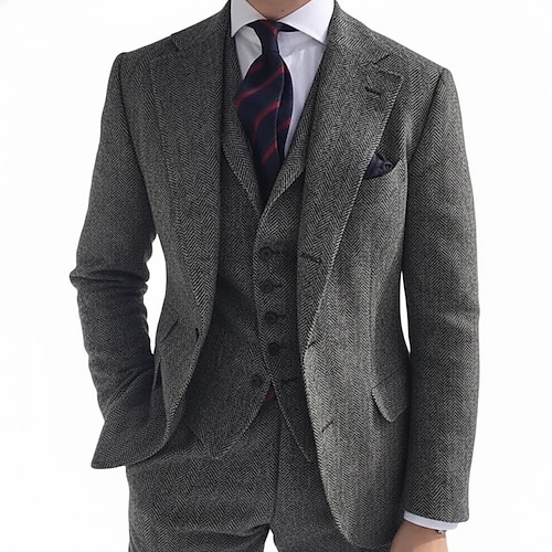 Uomo Affari Casuale Completi in Tweed Bavero classico Nero Grigio chiaro Quotidiano Formale Tinta unita Vestibilità su misura 3 pezzi Monopetto Due Bottoni