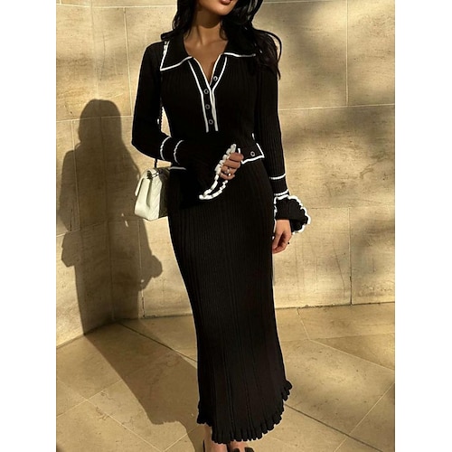 Per donna Abito maglione Elegante Casual Morbido Colore Puro A Coste Colletto a Camicia Bottoni Lavorato a maglia Manica Lunga Top lunghi Maglia All'aperto Quotidiano Weekend Nero Bianco Autunno