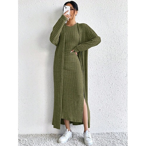 Per donna Insieme del vestito Tubino Elegante Casual Semplice Spacco Abito Midi Manica Lunga Girocollo All'aperto Vacanza Nero Rosa Cachi Estate Autunno Vestibilità regolare