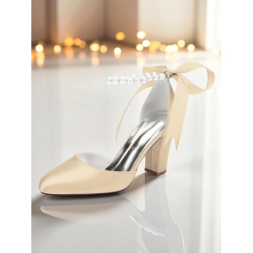 Scarpe con tacco da damigella d'onore per donna: scarpe con tacco a blocco e cinturino alla caviglia in perle color champagne, eleganti décolleté in raso per feste nuziali e occasioni formali
