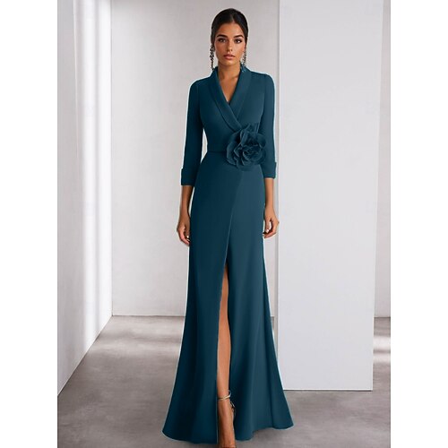 A-Line Abito da Sera Elegante Abito Formale Matrimonio Lunghezza Piena Manica Lunga Collo Camicia Crepe Elasticizzato con Spacco Fiore sulla Spalla