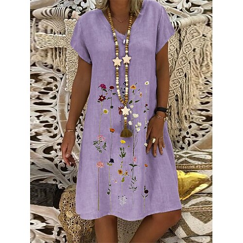 vestito estivo da donna con stampa botanica, scollo a V, manica corta, casual, largo, lunghezza al ginocchio, per uscite in spiaggia, per eventi diurni, bianco multicolore, comodo e traspirante,