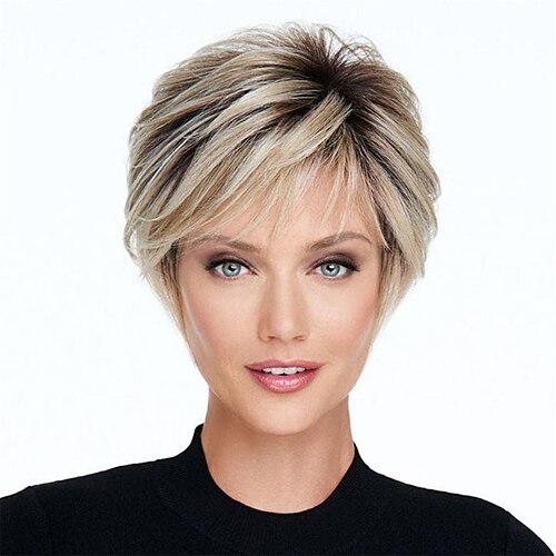 Parrucche bionde per donna, parrucca a strati lunga fino alle spalle con radici scure, parrucca sintetica corta con frangia per uso quotidiano o cosplay.