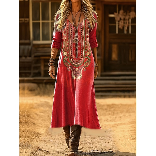 Per donna Abito maxi Tubino Festa Casual Boho Quotidiano Data Uscire Vestibilità comoda Floreale Grafico Paisley Manica Lunga Scollo a V Nero Rosso Viola Arancione Primavera Autunno Inverno