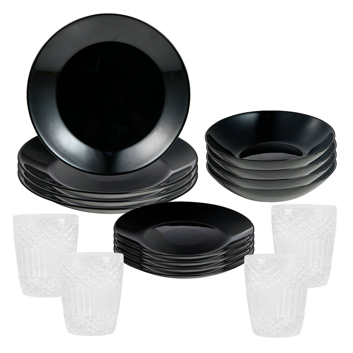 San Ignacio - 12-teiliges schwarzes Porzellan-Geschirrset mit Set aus 4 Gläser 300ml Transparent