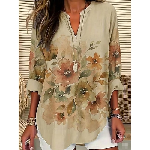 Per donna Camicia Tunica Floreale Grafico Bohemien Vintage Quotidiano Manica Lunga Scollo a V Top Regolari Quotidiano Ferie Stampato Cachi Estate Primavera