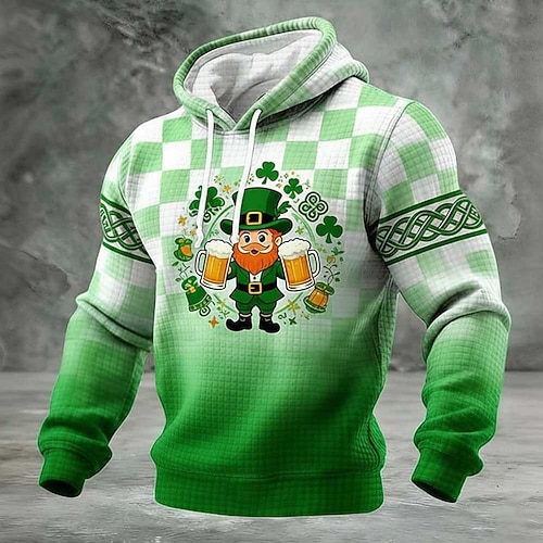 Felpa con cappuccio da uomo con motivo a nido d'ape, leprechaun che beve birra per il giorno di San Patrizio, maglione lavorato a maglia a scacchi con nodo celtico e trifoglio irlandese,