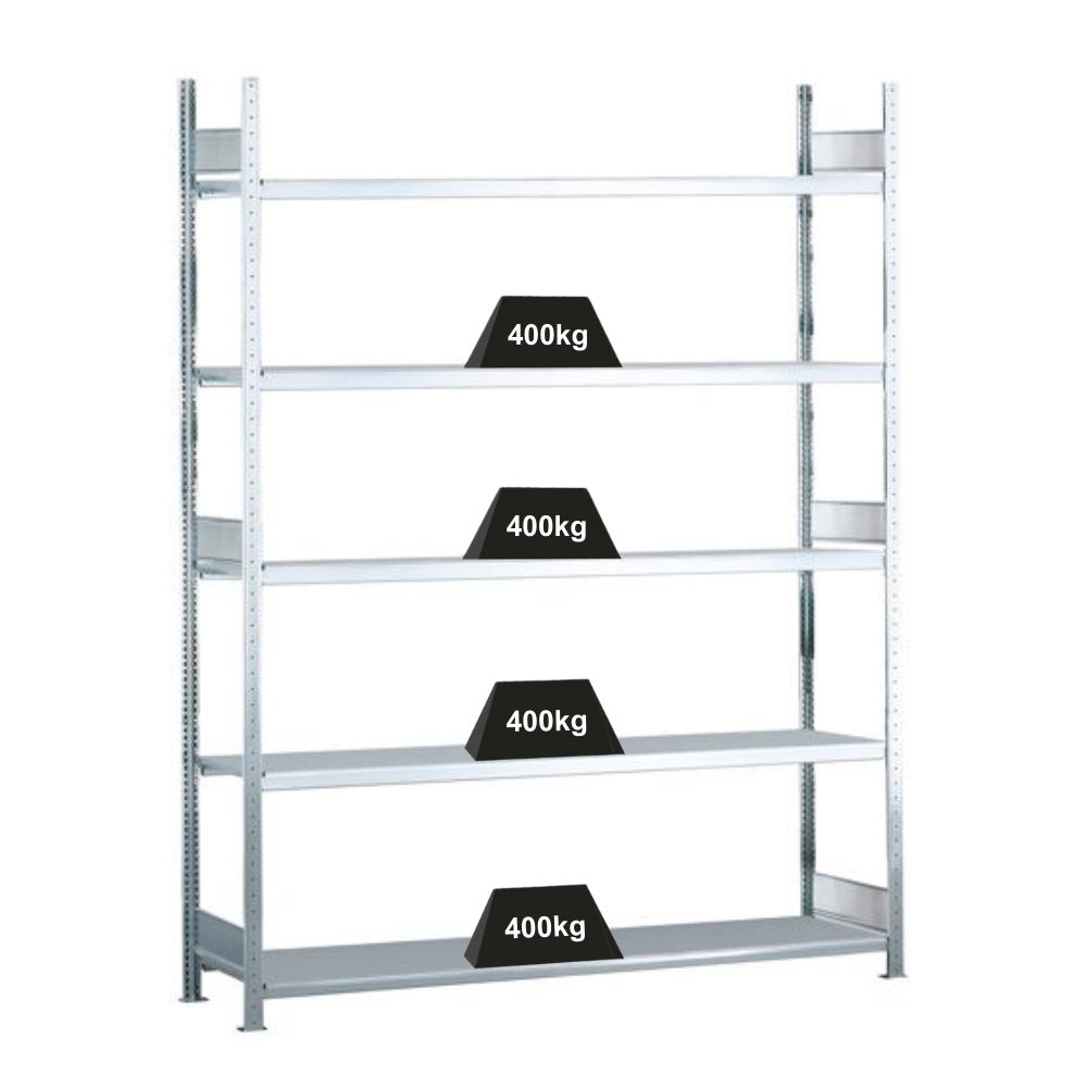 PROREGAL Weitspannregal mit Stahlböden WS 2000 | Grundregal | HxBxT 300x200x80cm | 5 Ebenen | Fachlast 400kg | Verzinkt