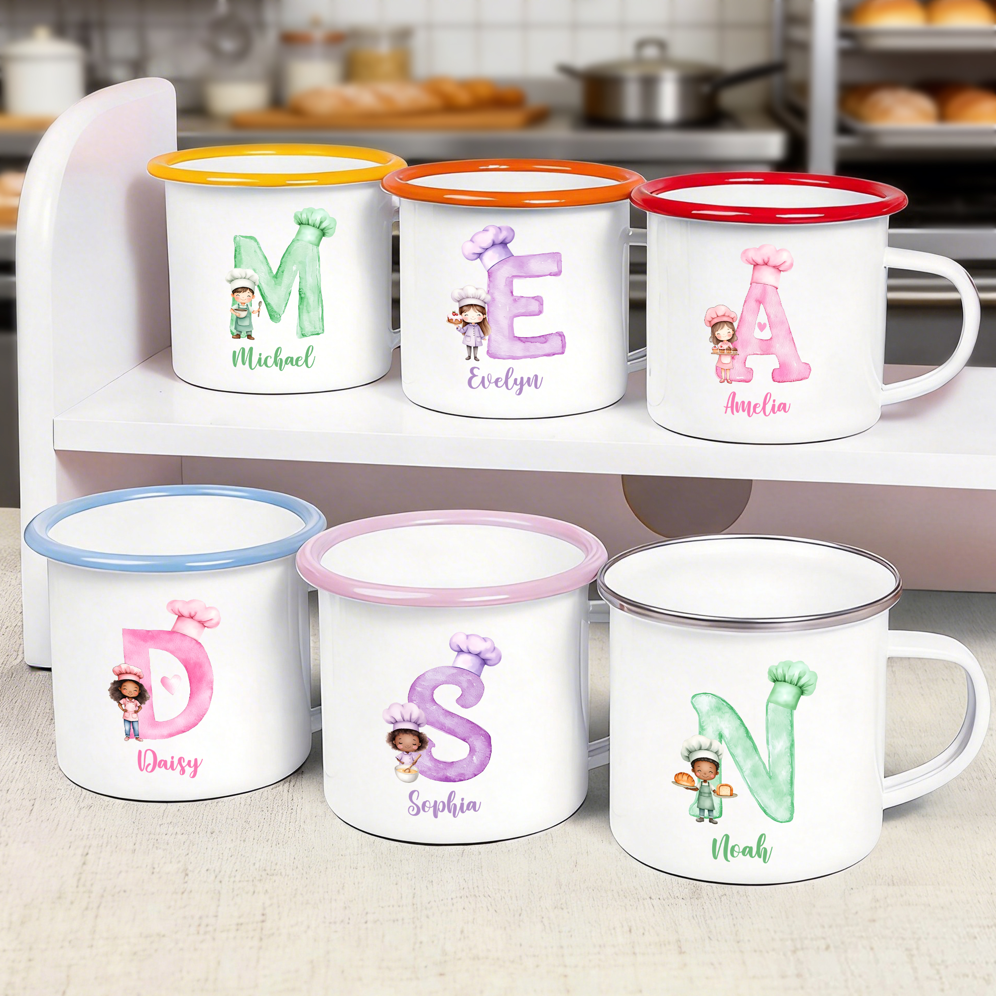 Personalisierte niedliche Aquarell Cartoon Chef Charakter 12 oz Emaille Becher mit Namen und Initialen Backen Geburtstagsgeschenk für Kinder