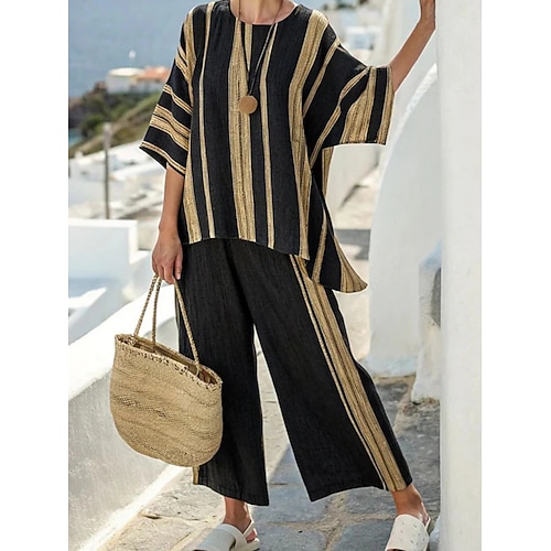 Completi di Pantaloni in Lino Sintetico Simile al Cotone per Donna Top Bolero Manica 3/4 Collo Rotondo a Strisce Moda Streetwear Casual Quotidiano Esterno Blu Nero Arancione Estate Vestibilità