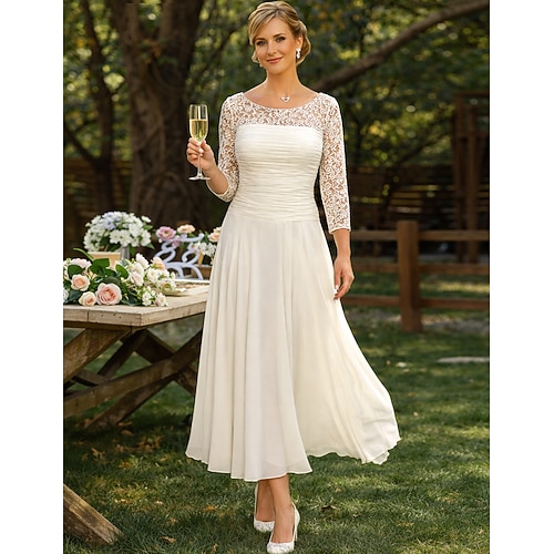 Linea ad A Lunghezza alla caviglia Vestito da Festa Abito da Cocktail Abito da invitata a nozze Abito da cerimonia per signora Manica 3/4 Collo gioiello Elegante Ospite di nozze Chiffon Pizzo con
