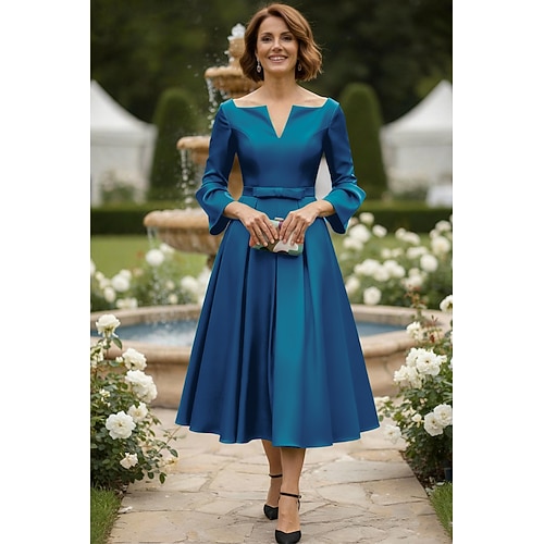 Linea ad A Lunghezza Tè Vestito da Festa Abito da Cocktail Abito da invitata a nozze Abito da cerimonia per signora Manica 3/4 Scollo a V Elegante Formale Ospite di nozze Raso con Fiocco/Fiocchi