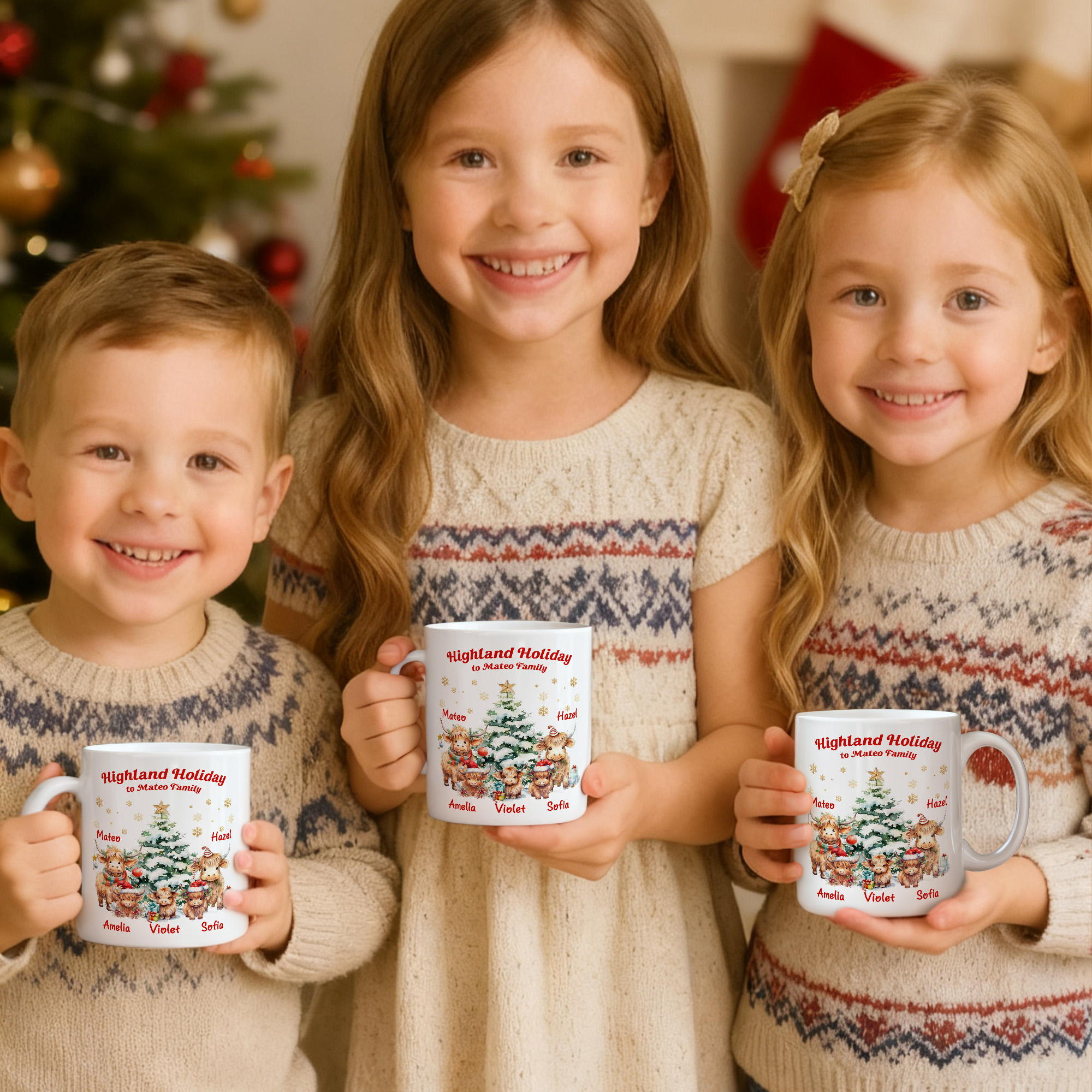 Personalizado lindo Highland Vaca Familia 11 oz Taza de café de cerámica con nombre Regalo de Navidad para la familia