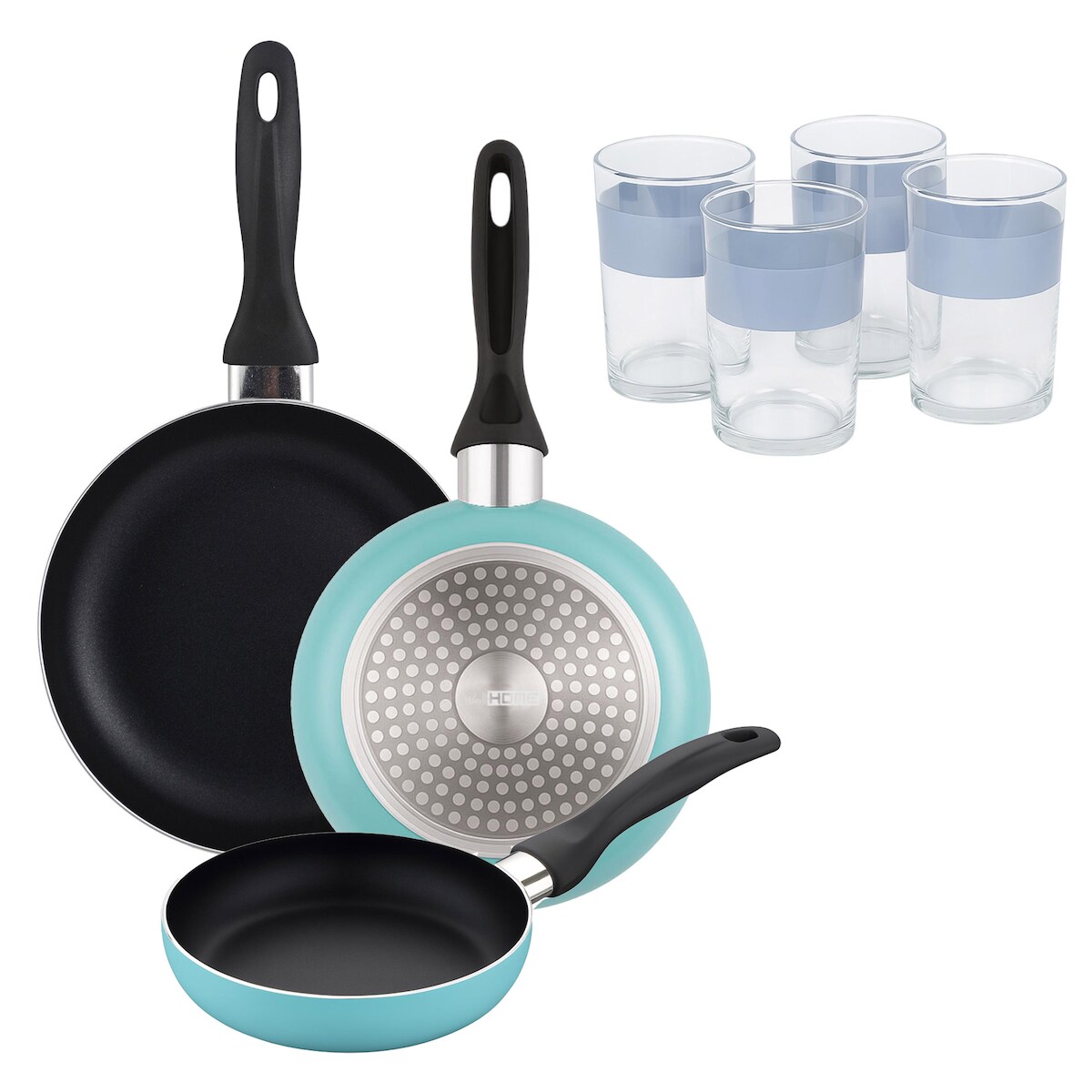 BERGNER - Set aus 3 Pfannen Ø16/20/24cm aus gepresstem Aluminium in matt-blau mit 4er-Set Gläser 0,5 L NOIA