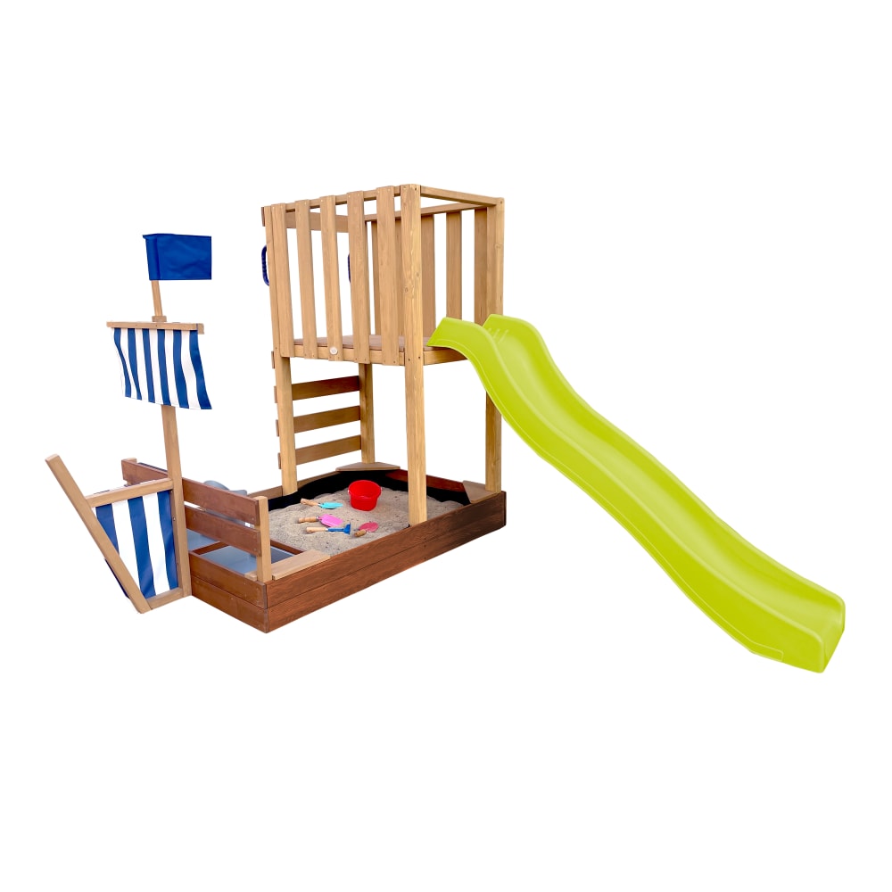 Parco giochi con arrampicata in legno marrone con scivolo verde chiaro