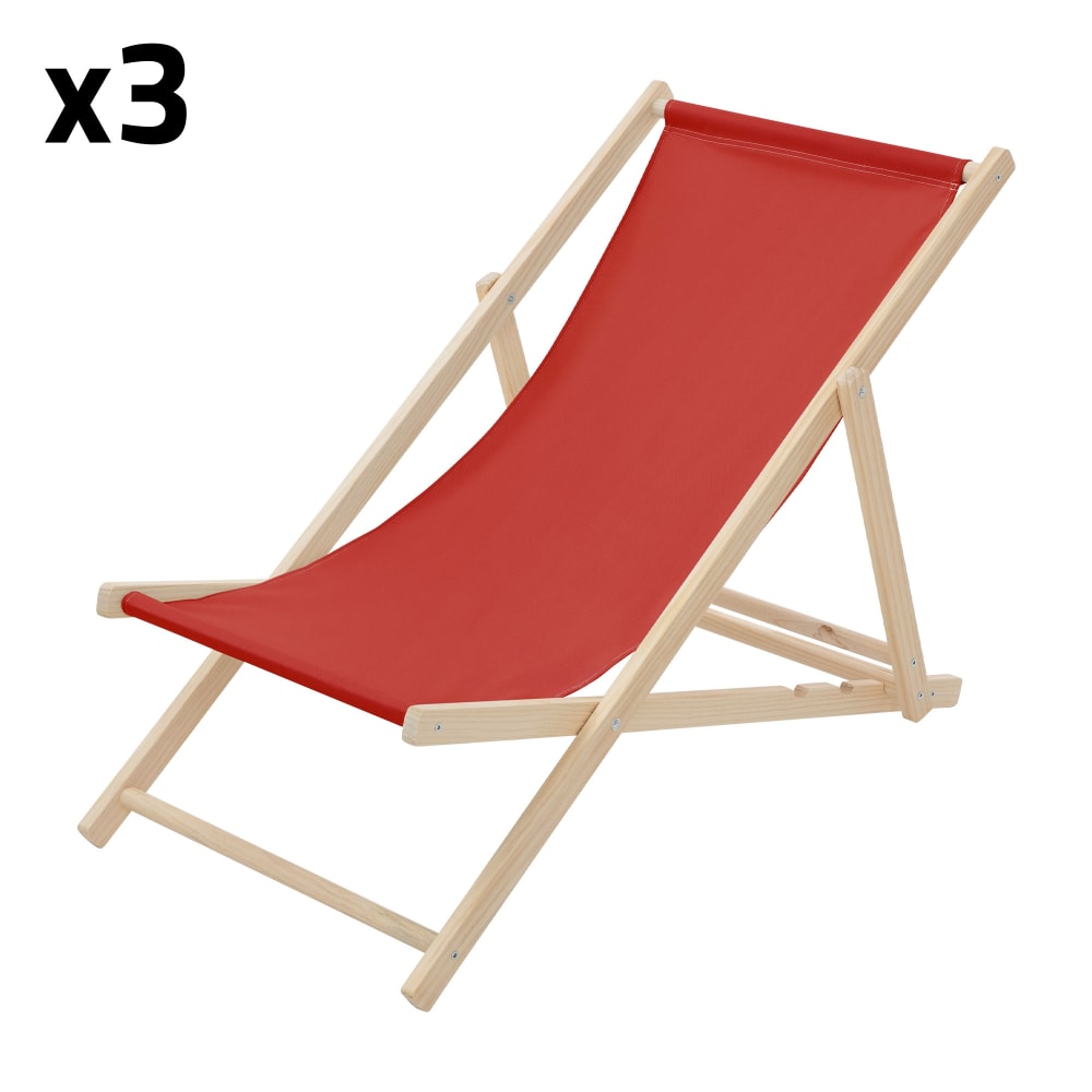 Set 3 sedie a sdraio rosso in legno di pino con schienale regolabile