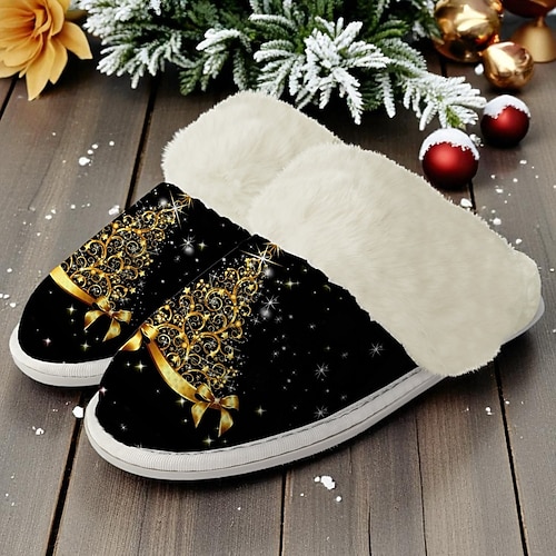 pantofole da donna dorate a forma di albero di Natale: elegante design ad albero dorato, morbida fodera in pelliccia per il massimo comfort, ideali per il relax durante le vacanze, la mattina di Natale e per fare regali in inverno