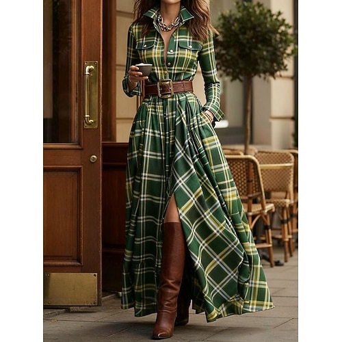 Per donna Abito maxi Abito a Tubino Vacanza Casual Boho Quotidiano Vestibilità regolare Plaid Manica Lunga Colletto a Camicia Blu Rosso Verde Primavera Autunno Inverno