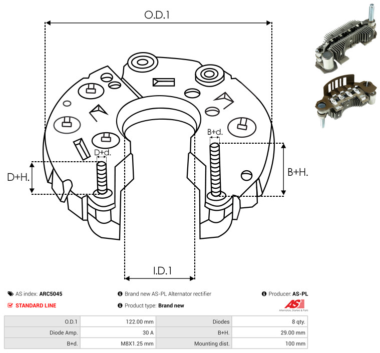 AS-PL Gleichrichter, Generator ARC5045 Universal 122,00mm für MITSUBISHI MAZDA JE48-18-W60B JE48-19-W60B JE48-18-W60