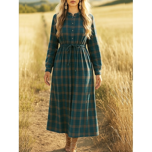 Per donna Abito Midi Abito a trapezio Casual Quotidiano Vestibilità regolare Plaid Manica 3/4 Girocollo Blu Rosso Marrone Primavera Autunno Inverno