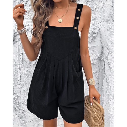 Salopette corta da donna, casual, tinta unita, senza maniche, scollo a U, bottoni, tasca, stile urbano, vestibilità regolare, nera, verde chiaro, marrone, estiva