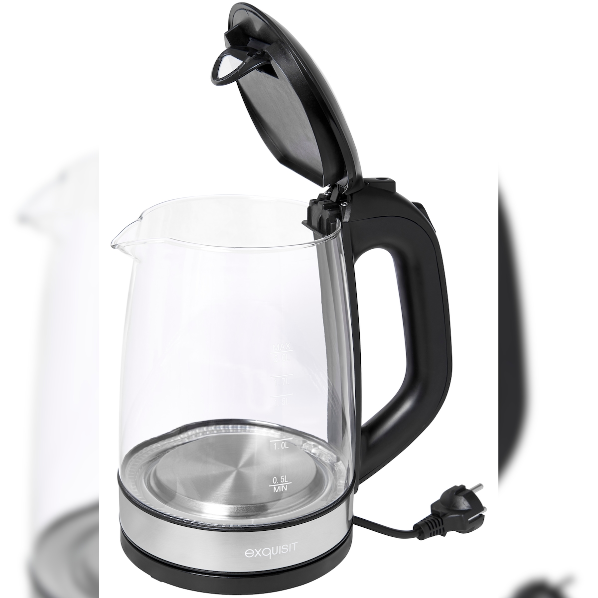 Exquisit Glas-Wasserkocher WK 3501 swg, Innenbeleuchtung, 2 Liter, 2200 Watt, Edelstahlverzierung, Schwarz