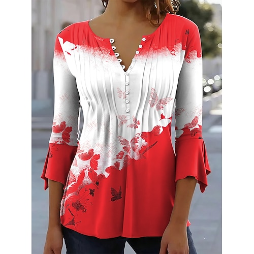 Per donna Blusa Ombre Grafico Farfalla Elegante Manica 3/4 Girocollo Top lunghi Quotidiano Uscire Volant Bottoni Nero Rosso Viola Marrone Primavera Autunno