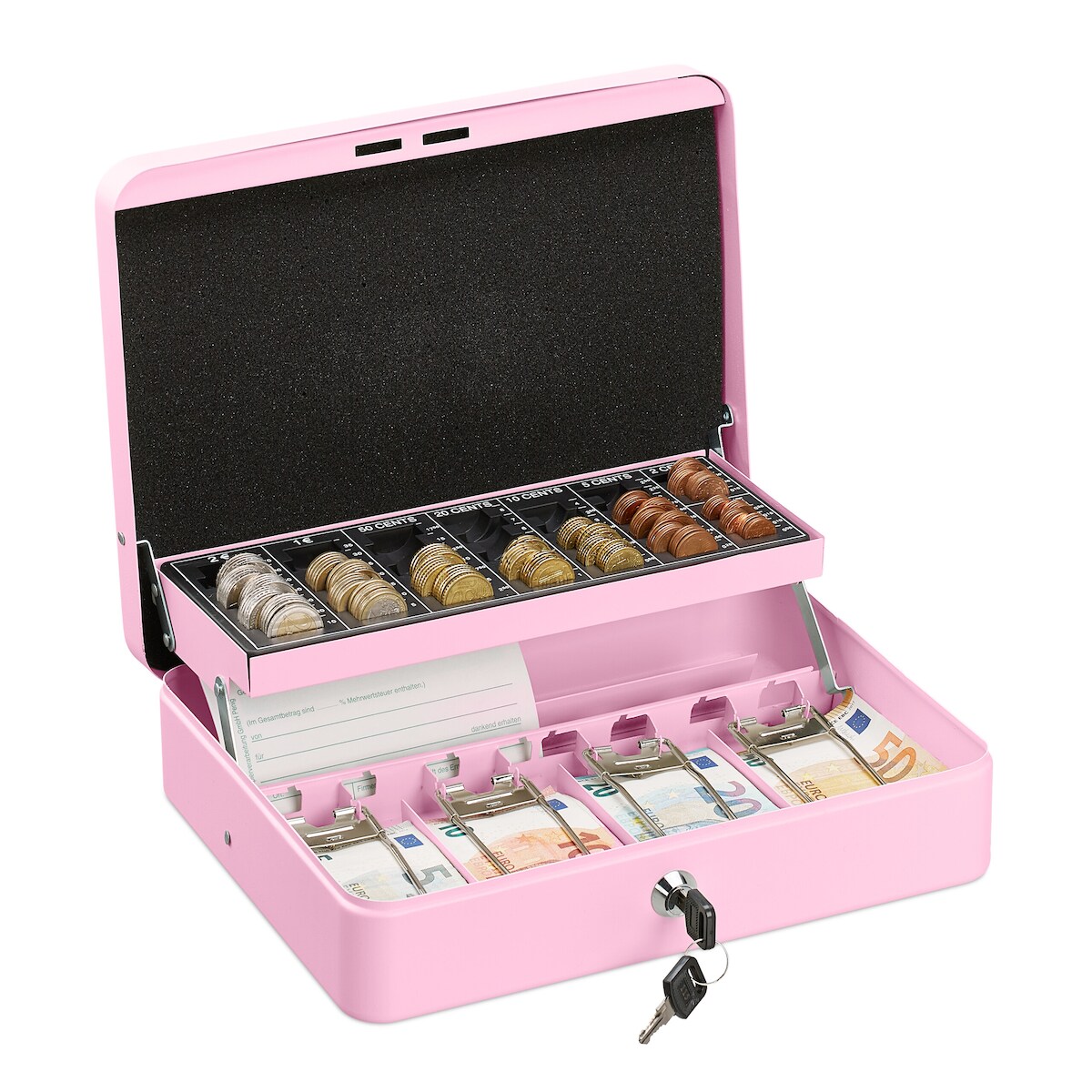Relaxdays Geldkassette abschließbar, Münzzählbrett & 4 Scheinfächer, Geldkasse Eisen, HxBxT: 8,5 x 30,5 x 24,5 cm, pink