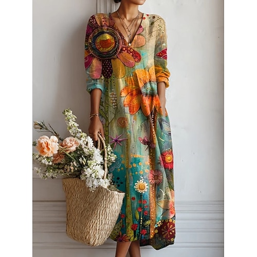 Pasqua Per donna Abito maxi Vestito Estivo Abito a trapezio Vacanza Casual Boho Ferie Vestibilità regolare Floreale Grafico Blocco di colori Manica Lunga Scollo a V blu navy Nero Rosa Arancione