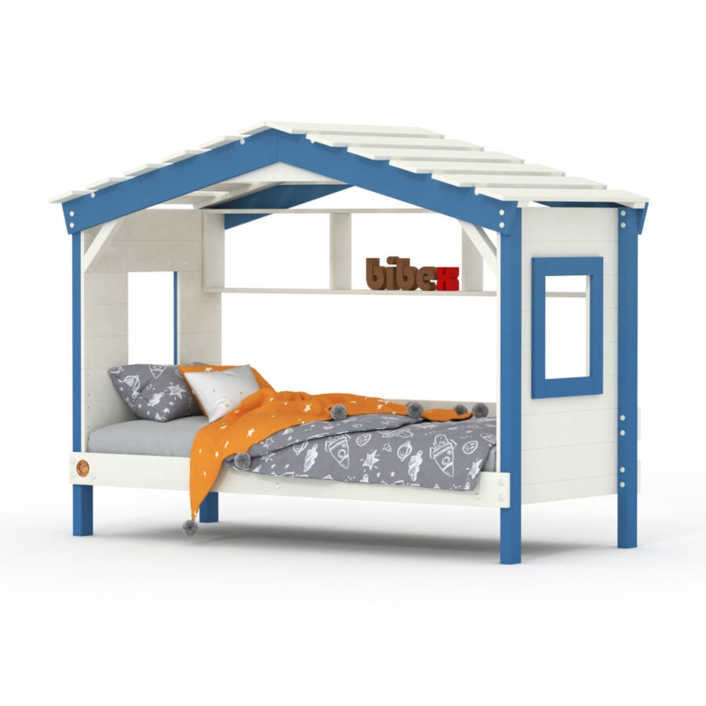 Letto a casetta e scaffale della casa blu in pino massiccio