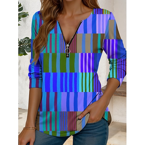 Per donna Maglietta Grafico Geometrico Vintage Elegante Casual Manica Lunga Girocollo Top Regolari Quotidiano Cerniera Stampato Blu Viola Arancione Verde Estate Primavera