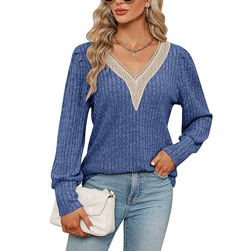 Per donna Felpa Maglione Quotidiano Elegante Casual Blocco di colori A Coste Scollo a V Lavorato a maglia Bordi in pizzo Manica Lunga Top Regolari Maglia Quotidiano Ferie Uscire Rosso bordeaux Nero