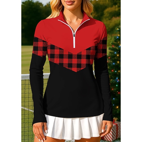 Per donna Blocco di colori A quadri Felpa Polo Top Maglietta Maglietta sportiva Manica Lunga Stampato Zip a un quarto Pullover UPF50 Resistente ai Raggi UV Protezione UV Elastico Traspirante