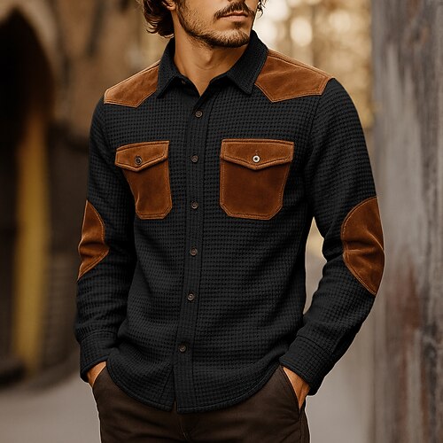 Per uomo Camicia Camicia casual Camicia con Bottoni Camicia cargo Camicia a maglia a nido d'ape Nero Kaki Manica Lunga Blocco di colori Testurizzato Bavero All'aperto Casuale Patchwork Abbigliamento