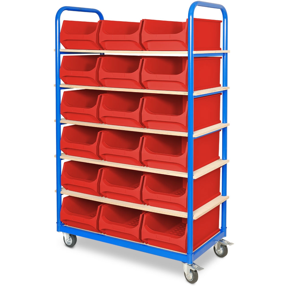 BRB Etagenwagen mit 6 Ebenen, BxTxH 1050x500x1690 mm, bestückt mit 18 Sichtkästen LB2 21,8 Liter, 2 Lenk-/2 Bockrollen (rot)