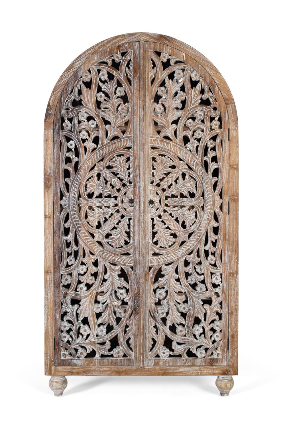 Armadio in teak con intaglio artigianale e finitura bianca lavata