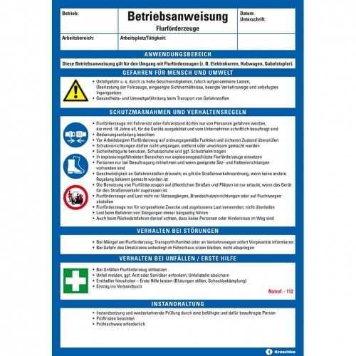 König Werbeanlagen Dreifke® Maschinenbetriebsanweisung Flurförderzeuge, Kunststoff, 210x297mm, ASR A1.3, DIN EN ISO 7010