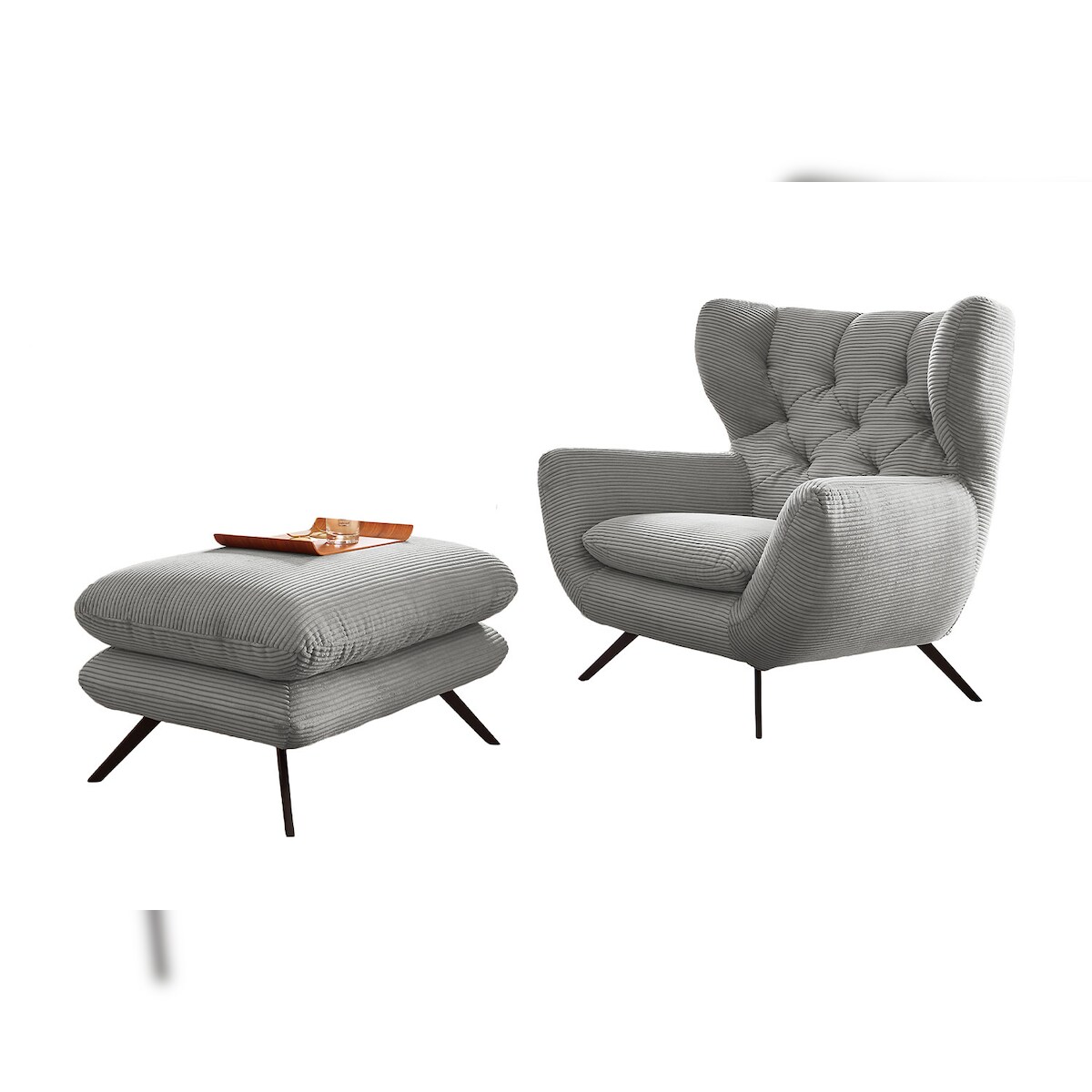 KAWOLA Sessel CHARME Hochlehnsessel Cord hellgrau mit Hockerbank
