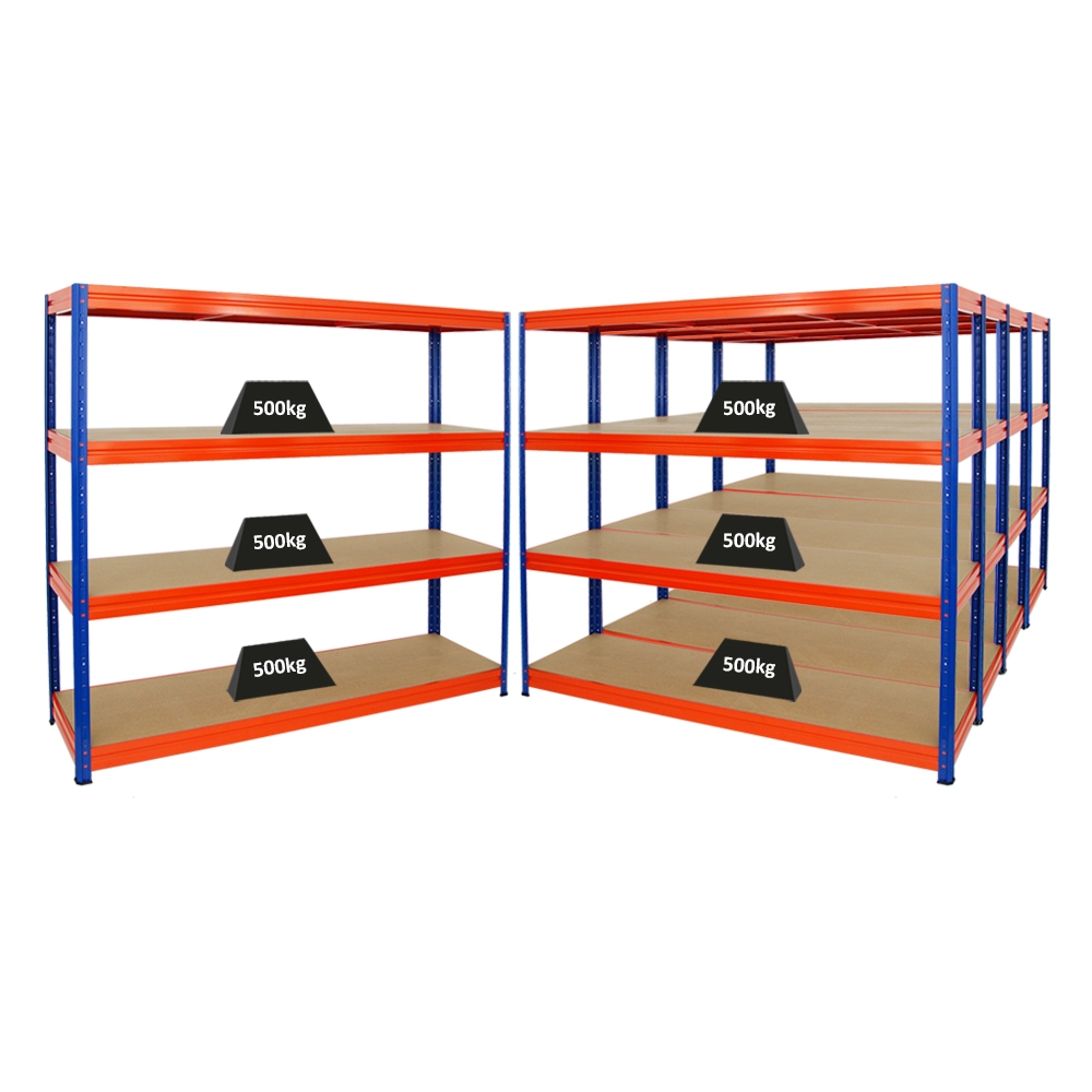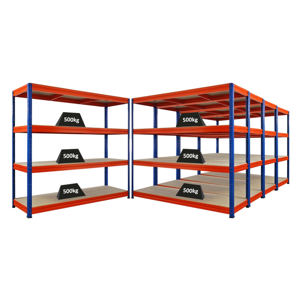 Proregal Mega Deal | 5x Schwerlastregal DINO | HxBxT 180x200x60cm | 4 Spanplatten-Ebenen 16mm | Fachlast 500kg | Blau/Orange