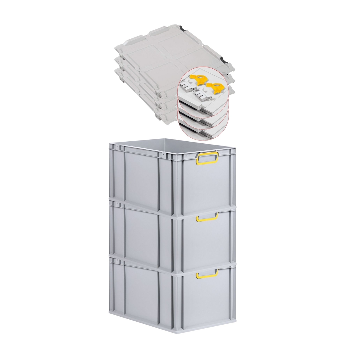 PROREGAL 3x Eurobox NextGen Color mit Scharnierdeckel & Verschlüssen | HxBxT 22x40x60cm | 65 Liter | Griffe gelb geschlossen | Verstärkter Boden