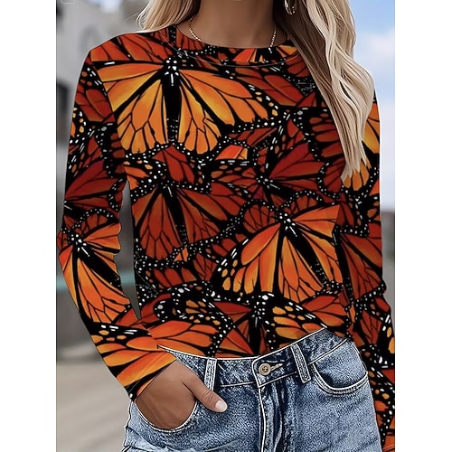 Per donna Maglietta Grafico Farfalla Vintage Moda Elegante Manica Lunga Girocollo Top Regolari Quotidiano Weekend Stampato Blu Viola Arancione Verde Estate Primavera Autunno