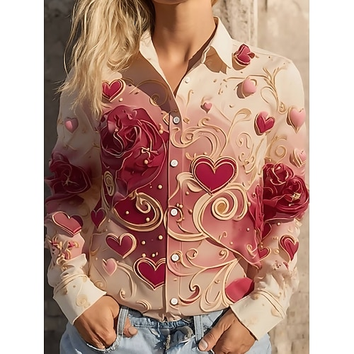 San Valentino Per donna Camicia Cuore Grafico Vintage Elegante Moderno Manica Lunga Colletto a Camicia Top Regolari Quotidiano Ferie Rosa Estate Primavera Autunno Inverno