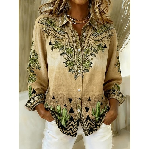 Per donna Camicia Blusa Floreale Grafico Geometrico Bohemien Vintage Casual Manica Lunga Colletto a Camicia Top Regolari Quotidiano Patchwork Bottoni Stampato Arancione Marrone Verde Primavera
