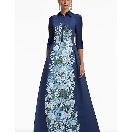 Abito da sera A-Line per la madre della sposa abito elegante formale da matrimonio lungo fino al pavimento maniche lunghe colletto camicia con tasche in satin con stampa floreale