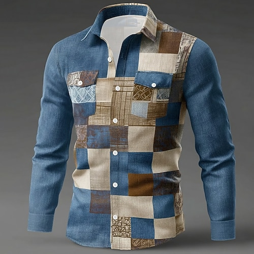 Per uomo Geometrico Blocco di colori Patchwork Camicia Camicia con Bottoni Manica Lunga Moda Casual All'aperto Abbigliamento Quotidiano Primavera Autunno Collo ripiegato Due tasche anteriori Camicia