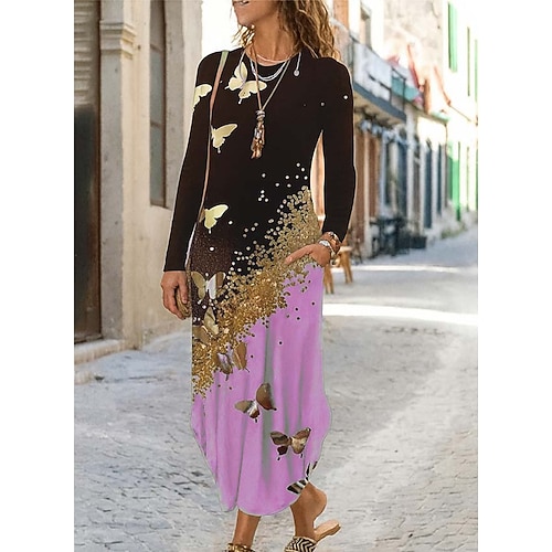 Per donna Abito maxi Abito a trapezio Vacanza Casual Quotidiano Vestibilità regolare Vestibilità comoda Floreale Grafico Manica Lunga Scollo a V Rosa Rosa scuro Rosso Blu Estate Primavera Autunno